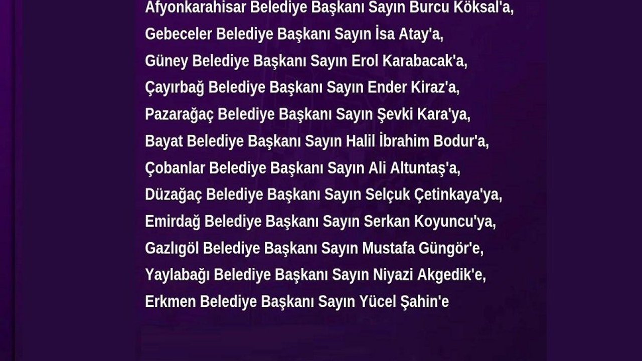 AFYOK Grubu tarafından yayımlanan mesajda, "Altay deplasmanı için grubumuza desteklerinden dolayı teşekkürlerimizi sunarız" denilerek araç tahsisinde bulunan şu belediye başkanları tek tek sıralandı: