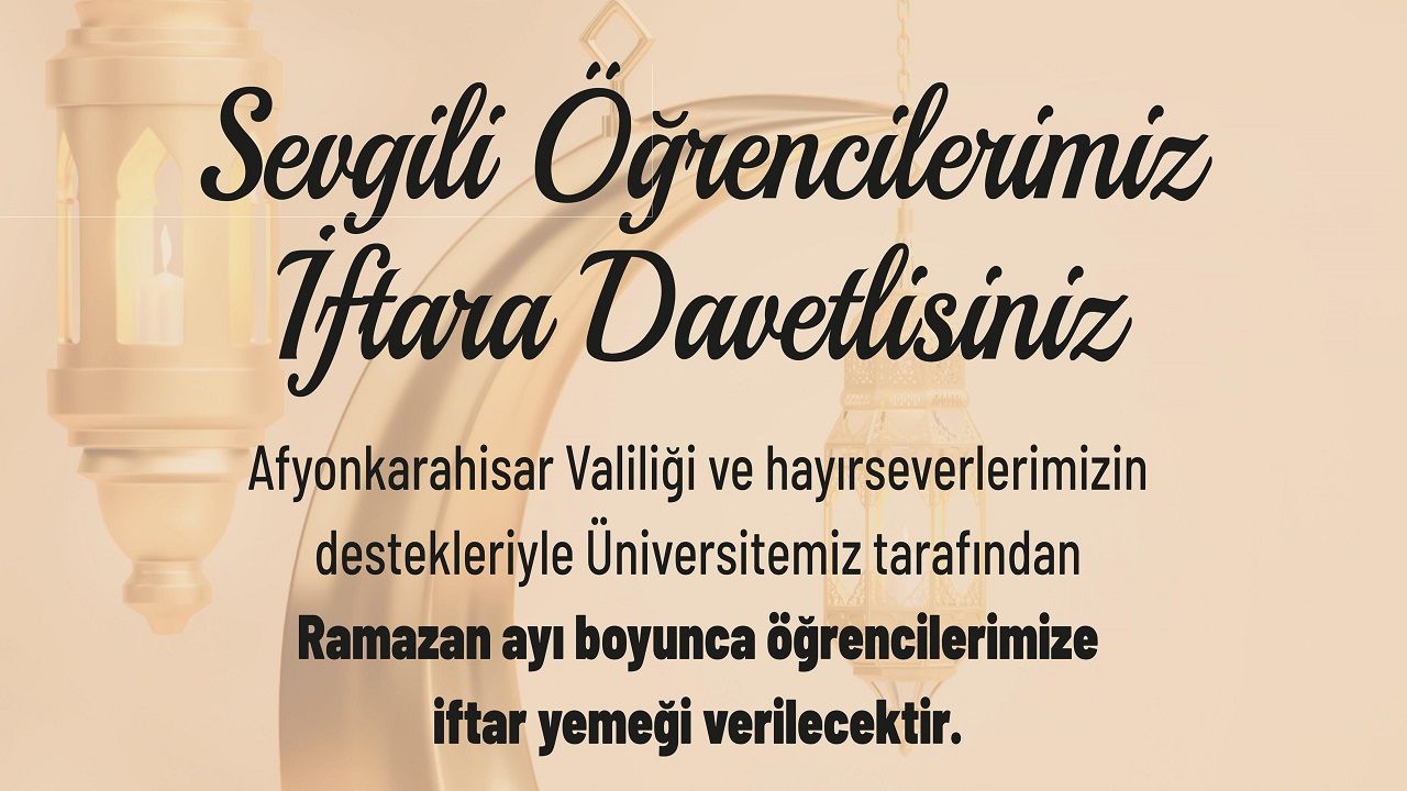Afyonkarahisar Valiliği ve hayırseverlerin destekleriyle, Afyon Kocatepe Üniversitesi (AKÜ) ve Afyonkarahisar Sağlık Bilimleri Üniversitesi tarafından öğrencilere Merkezi Yemekhanede ücretsiz iftar yemeği verilecek.