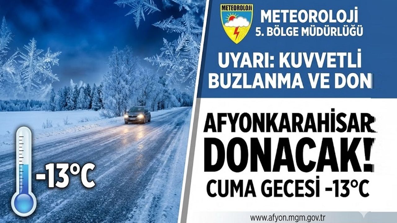 Afyonkarahisar’da etkili olan kar yağışının ardından Meteoroloji 5. Bölge Müdürlüğü korkutan bir uyarı yaptı. Kar yağışının Perşembe günü kenti terk etmesiyle birlikte aşırı soğuklar kapıda. Cuma gecesi termometrelerin eksi 13 dereceyi göstermesi bekleniyor.